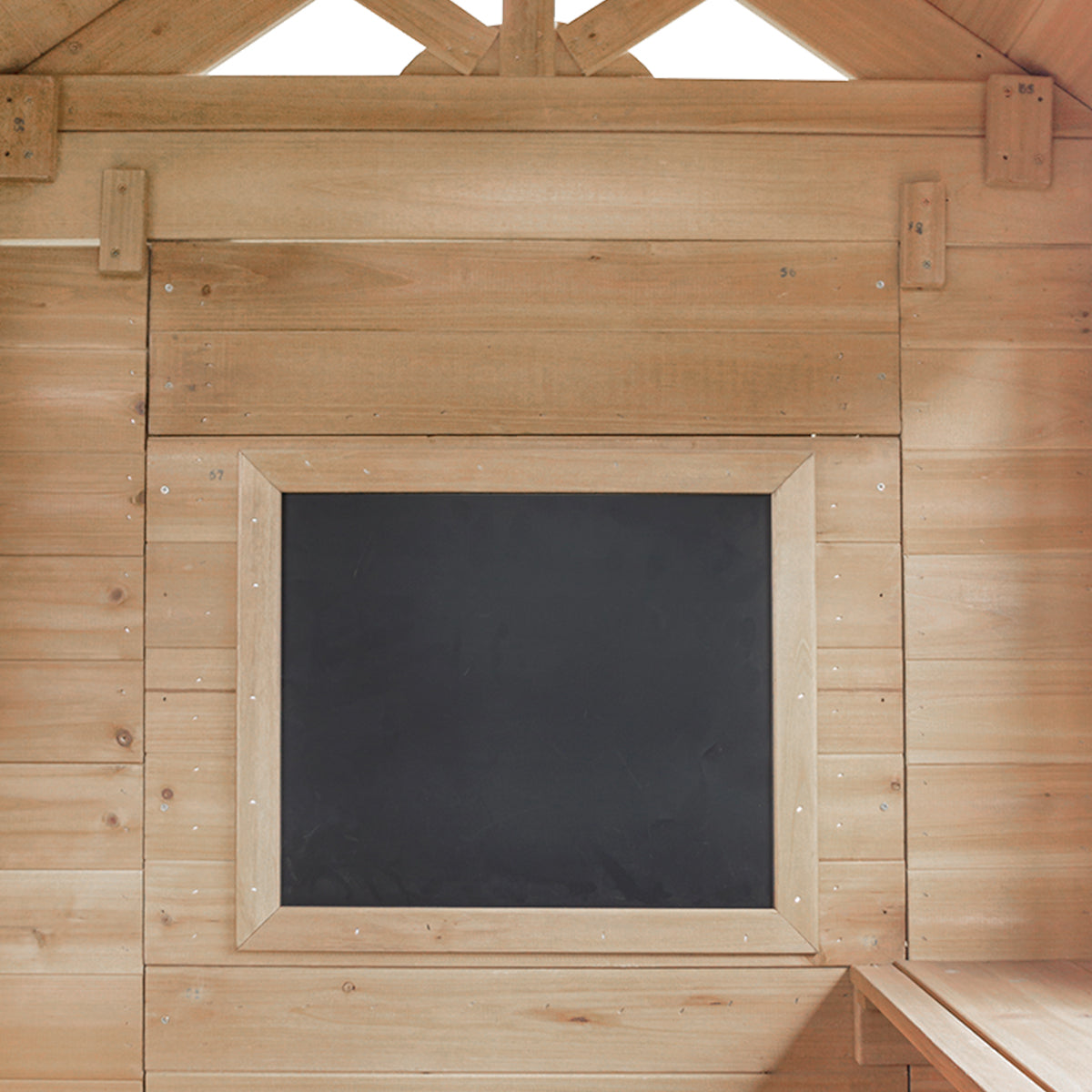 Raised playhouse with light, easy to use door and sunburst windows