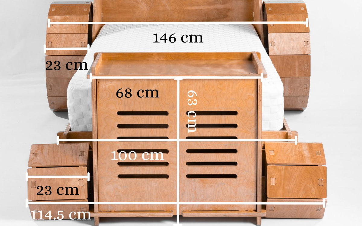 Lumina is a bedroom furniture suite that incorporates bed frame, nightstand and cabinet with desktop in one. It achieves aesthetics, versatile functionality and sustainability all at the same time, and it provides ample space for rest, activity and storage.