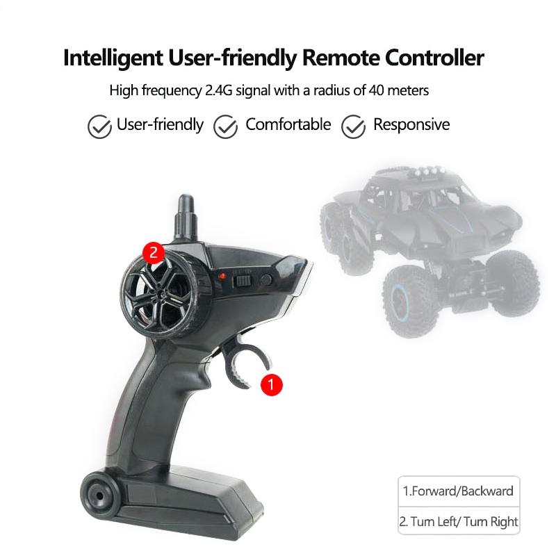• 6WD remote control car equipped with shock absorbers and independent suspension system, high tenacity rubber tire, strong climbing performance, impact resistance and strong grip make it possible to overcome more difficult obstacles, to climb mountains, to run on the lawn or in the desert