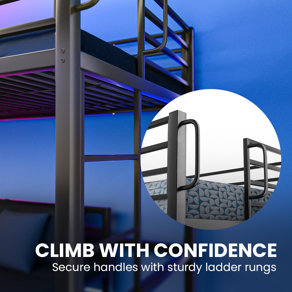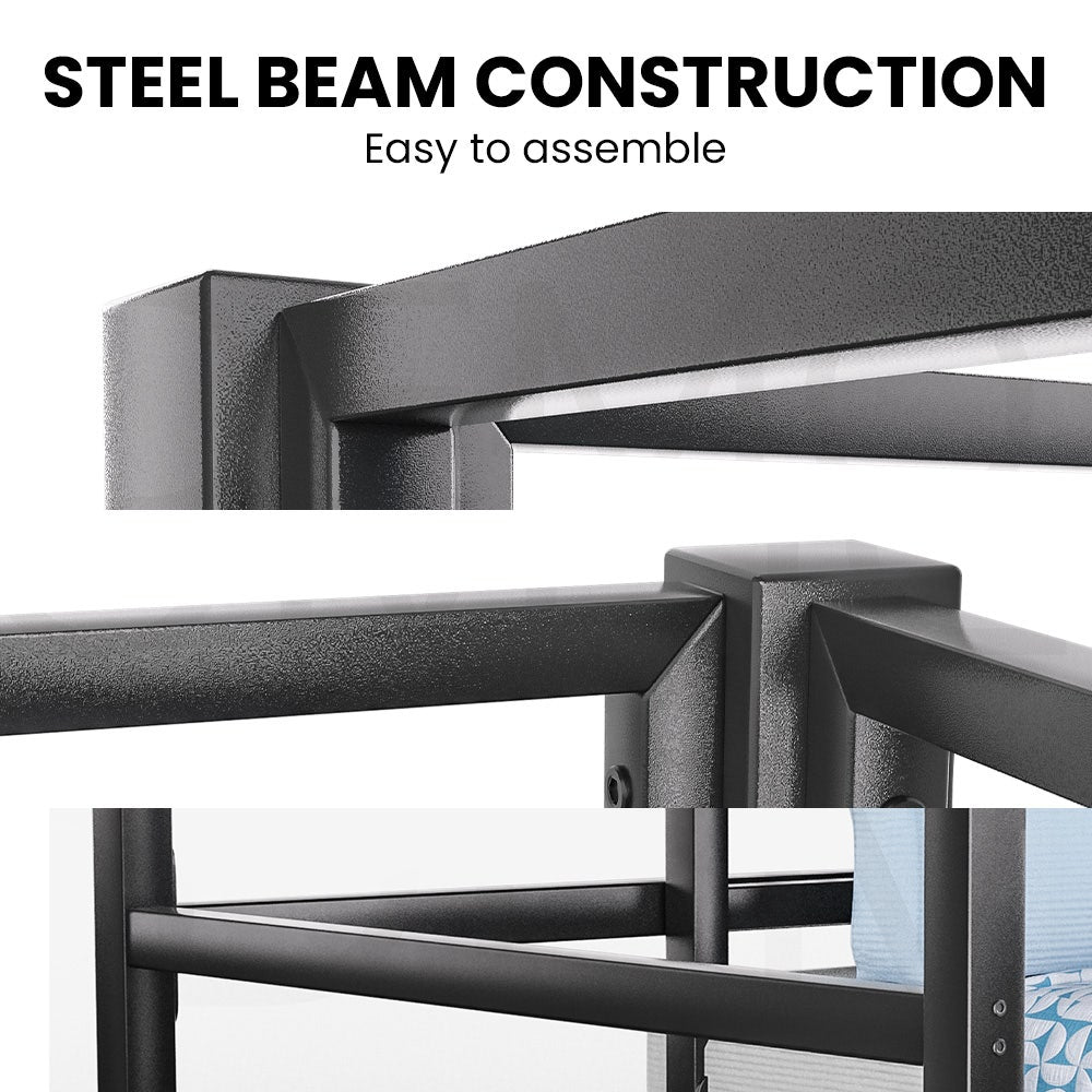 Clean lines. No fuss. Its sturdy metal frame suits any room style, while both levels fit standard single mattresses - no custom sizes, no hassle.